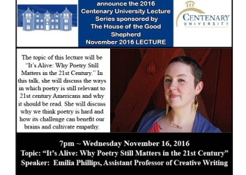 Emilia Phillips, Assistant Professor of Creative Writing, will discuss "It's Alive: Why Poetry Still Matters in the 21st Century" on November 16. She will discuss the ways in which poetry is still relevant to 21st century Americans and why it should be read; why we think poetry is hard and how its challenge can benefit our brains and cultivate empathy.