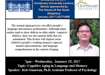 Rutherfurd Hall is pleased to announce the 2017 Centenary University FREE Lecture Series sponsored by The House of the Good Shepherd. This lecture will explore areas related to people's working memory capacity, mental representations, and language comprehension in the context of aging.