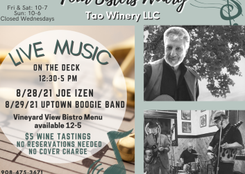 Come enjoy the beautiful view and live music on the deck with Joe Izen on Saturday and Uptown Boogie Band on Sunday. $5 wine tastings for up to 8 wines and no reservations required. Wine will be available for purchase by the glass or bottle along with our Vineyard View Bistro Menu.