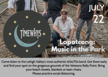 Rescheduled due to poor weather: TimeWhys perform the great music of the '60s, recreating those captivating times when songs by The Beatles, The Rolling Stones, and The Who filled the airwaves. Funding has been made possible, in part, by the Warren County Cultural and Heritage Division of Land Preservation.