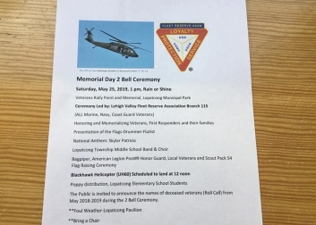 Memorial Day 2 Bell Ceremony will be held at Veterans Rally Point and Memorial, Lopatcong Municipal Park. Public is invited to attend the honoring and memorializing of Veterans, First Responders and their families. More details are in the attached photo.
