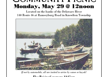 Activities will include a flag raising ceremony, self-guided scenic walks along the Delaware River and music by Don Elliker. An open table pot-luck picnic will include a dish and drink of your choices as well as a grill available for burgers, dogs and other assorted BBQdelicacies.