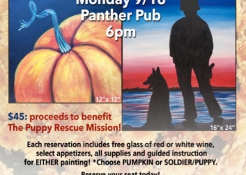 Each reservation includes a free glass of red or white wine, select appitizers, all supplies and guided instruction.  Choose to paint a soldier/puppy or a pumpkin!  Go to the website for more details.