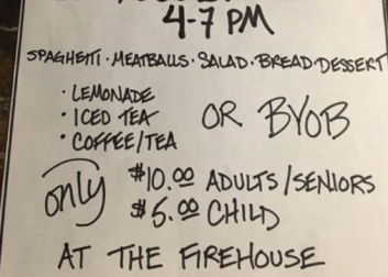 $10/ adult; $5/child. Spaghetti, meatballs, salad, bread and dessert; lemonade, iced tea, coffee/tea (or BYOB).