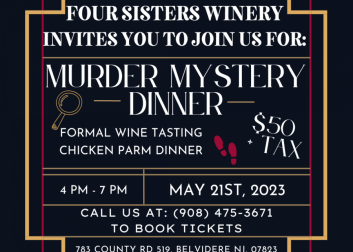 This thrillingly epic event, Murder Mystery Dinner at Four Sisters Winery, will be one that you won't want to miss! This is an interactive dinner begs the question can you identify the perpetrator? You, your friends, and fellow gumshoes will enjoy equally hilarious and mystifying entertainment. The characters will definitely have you in stitches and yes, you could be one of the characters.