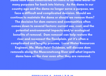 Join MWA and local expert, Mary Paist-Goldman as she discusses the impact dams have on the river and what their removal means for our local ecology. This event is free to attend, but please register here.