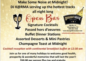 Festive party favors will be provided to make some noise at midnight, DJ K@rma will be serving up the hottest tracks all night long. Party starts at 9pm to 1am followed by continental breakfast.
