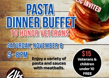 The public is invited to a pasta dinner buffet to honor our veterans. Enjoy a variety of pasta and sauces with meatballs.