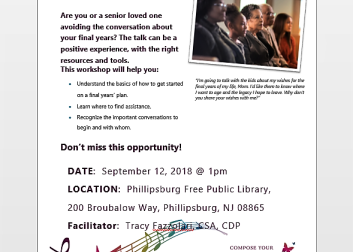 Sorry, but this event has been canceled. This free workshop will help your Senior loved one understand the basics of how to get started on a final years’ plan, learn where to find assistance and recognize the important conversations to begin and with whom. This workshop is facilitated by Tracy Fazzolari, CSA, CDP from Home Instead Senior Care. Register in person or call (908) 454-3712 or go online at the library’s website to complete the registration.
