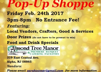 Almond Tree Manor Premiere Banquet & Catering Facilities presents a Pop-Up Shoppe featuring Local Vendors, Crafters, Goods & Services. Door prizes (do not have to be present to win) plus food and drink specials. No entrance fee!