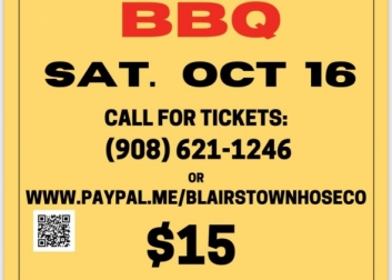 A take out only fundraiser for Blairstown fire company. Tickets are $15 each and include BBQ pulled pork, baked beans, coleslaw, baked potato, roll and dessert!