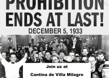 Flappers, Mobsters & Bootleggers welcome! Come to Villa Milagro to celebrate th 83rd anniversay of the repeal of Prohibition. Free wine cocktail if you say the secret password (Bee's knees); gift to all who can pass the Prohibition test; free cocktail to any couple who can do the Charleston! Take your photo in the Juice Joint Jail.