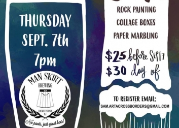 Tap into your creative side with a pint in one hand a paint brush in the other. Art Across Borders will be providing an assortment of crafts for you to create such as rock painting, collaging on a cigar box, and paper marbling. Cost is $25 if you register before the event, $30 day of. This cost is for you to create all of the projects! Please specify in your email when you register if you will have kiddos participating. If you came last month please feel free to come again and bring new friends!
