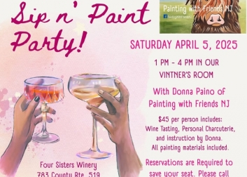 Four Sisters hosts a Sip N' Paint instructed by Donna Paino of Painting with Friends NJ. Enjoy a wine tasting and personal charcuterie, while painting a Shetland Cow with a Floral Wreath headband.