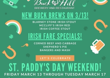 Celebrate St. Patrick's Day all weekend, Friday trhough Tuesday, with Irish fare specials and new Buck Brews to be released Friday, March 13: Blarney Stone Irish Stout, Mccliff's Irish Red and Irish Coffee Stout.