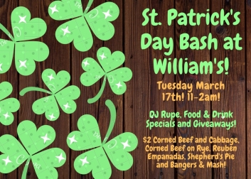 $2 food specials all day, including corned beef sandwiches, corned beef & cabbage, bangers and mash, shepherd's pie, and our annual Reuben Empanadas made by our neighbors Empanada Mamasita! Live entertainment by DJ Rupe and giveaways/prizes all night!