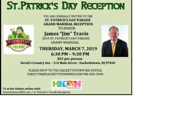 The Hackettstown BID kicks off parade weekend with a Grand Marshal Reception to honor 2019 St. Patrick’s Parade Grand Marshal, James "Jim" Travis. The reception dinner will be held at David's Country Inn. All are welcome to reserve seating through online ticket purchase at www.HackettstownBID.com via PayPal, in-person at the BID office, or by phone. Payment will be accepted by check or credit card as well.