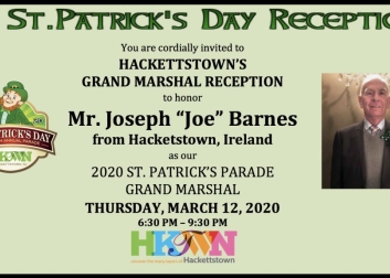 Reception to honor 2020 St. Patrick’s Parade Grand Marshal, Mr. Joe Barnes from Hacketstown, Ireland. The reception dinner features a live performance by Rory O’Moore School of Pipes and Drums and a dance performance by Slattery School of Irish Dance.