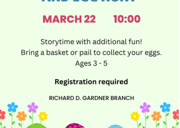 Storytime will conclude with an egg hunt in the Children's Room! Bring a basket or bucket to hold your eggs.