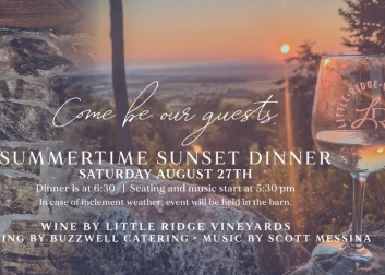 Enjoy dinner with live music as the sun sets over the mountain ridge, vineyards and farm. Wine by Little Ridge Vineyards, Buzzwell Catering and live music by Scott Messina.