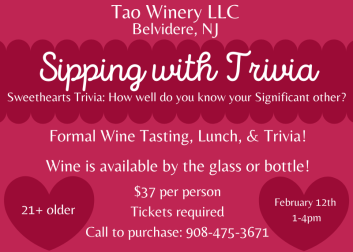 How well do you know your significant other? Formal wine tasing, lunch and trivia! 37/person, 21+