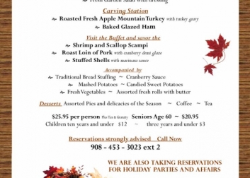 Enjoy a traditional Thanksgiving Feast at Apple Mountain Golf. Bring your family and friends. Tickets are $25 for Adults, Children 12 & under are $12 and Seniors 60 and older are $20.95. Reservations are strongly recommended, so, please call 908-453-3023 extension 2 now!
