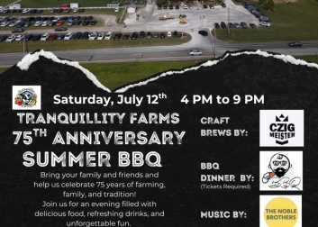 BBQ Dinner by Bearded Baby Que (tickets required) - Craft Brews by Czig Meister - Live Music by The Noble Brothers - Tranquillity Farms' Ice Cream Specials - Kid-Friendly Fun Includes: Giant Bounce Pillow, Cow Train Rides, Scenic Family Hayrides.
