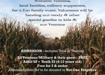 Trick-or-treat in the Corn Maze from 4pm to 7pm. Welcome Veterans, local families, military supporters, for a fun family event. Volunteers will be handing out candy & other special goodies to kids & our Veterans.