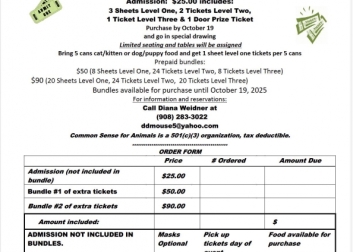 Taking place at Belvidere Manor comes a fundraiser for Common Sense for Animals. An admission of $25 gets you 3 sheets of Level 1, 2 sheets of Level 2, 1 sheet of Level 3 and a door prize ticket. Bring 5 cans of cat or kitten food or 5 cans of puppy and dog food and get an extra Level 1 sheet.