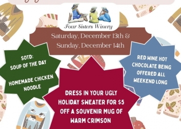 Show up to Four Sisters Winery in your "ugly" holiday sweater for $5 off a souvenir mug of Warm Crimson! The winery will also be serving Red Wine Hot Chocolate as a special and homemade chicken noodle soup all weekend.