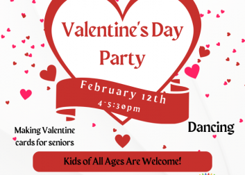 Kids of all ages are welcome to the Valentine's party. Come to make Valentine's cards, dance, craft and play games.