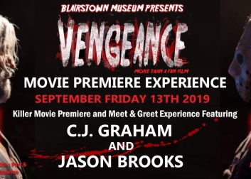 The Blairstown Museum proudly presents the premiere of Friday the 13th: Vengeance at Roy's Hall! Choose from two show times, plus every ticket holder will also experience a Meet & Greet with C.J. Graham, Jason Brooks, and Brandon "Buggzy" Wilson - complete with autographs, photo opportunity, and artifacts from the movie on display! Plus the chance to meet director Tom McLoughlin!
