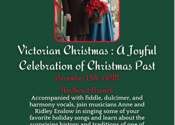 Join Anne and Ridley Enslow for a joyful celebration of Christmas past with a special emphasis on the Victorian Christmas traditions-Christmas trees, carols, cards, and accompanied with fiddle, dulcimer, and harmony vocals. Join in singing some of your favorite holiday songs and learn about the surprising history of one of our most popular holidays. This program is appropriate for adults and teens.