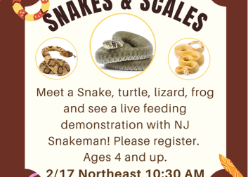 Meet the creatures that hiss and slither with N.J. Snakeman. See snakes, turtles, lizards, frogs and a live feeding demonstration! Please register. Ages 4 and up.
