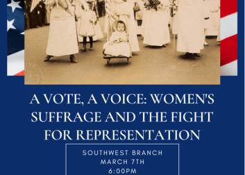This program will examine the long history of women's activism over the course of the nineteenth century, to highlight the multi-faceted mosaic of the women's suffrage movement. Taking place at Southwest Branch library, participants will explore the diverse paths-from educational access and abolitionism to temperance and suffrage-that led women to engage in civic and public life to make a difference in their own communities.