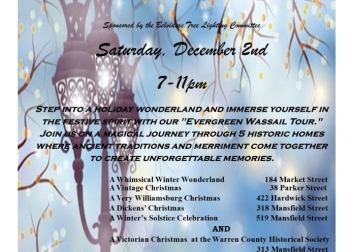 Tour through five historic homes and the Warren County Historical Society. Tickets can be purchased through The Cellar Door and Found, Tracey Williamson and Rebecca Lucas. This event is sponsored by the Belvidere Tree Lighting Committee and trolley transportation will be available.
