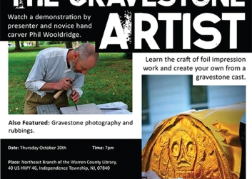 Let us introduce you to the striking and beautiful work of the early New England and New Jersey gravestone carvers, though images, a carving demonstration, and hands-on participation. We cover the evolution of hand-carving, to modern-day laser etching, and also feature the renaissance of some modern-day hand-carvers of our acquaintance. The journey will include a demonstration by presenter and novice handcarver Phil Wooldridge. We also talk about recording gravestone art and lettering through photography and rubbings, and will teach the craft of making a foil impression, from a gravestone cast. Call to register to be part of the foil impression workshop piece. This presentation is for adults and focused teens.