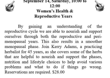 By gaining an understanding of the reproductive cycle we are able to nourish and support ourselves through both the reproductive and peri-menopausal years. This also results in a smoother menopausal phase. Join Kerry Adams, a practicing herbalist for 45 years, as she covers some of the herbs that are helpful to nourish and support the phases, nutrition and lifestyle choices to help avoid various problems and what to do if things go wrong. Reservations are required. Cost is $28.