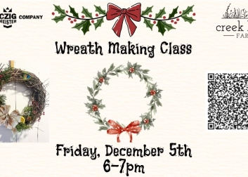 Creek Bend Farm is hosting a wreath making class at Czig Meister. This is a one-of-a-kind 18” grapevine wreath, a symbol of warmth, joy, and a festive welcome to all. Choose from a variety of materials like farm fresh cedar & evergreens, dried florals, cinnamon sticks, star anise, dehydrated oranges, metallic accents, and decorative elements to create a wreath that suits your unique style.