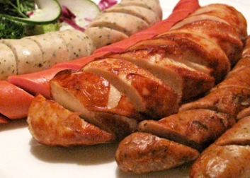 Liverwurst, Smoked Salmon, Deviled Eggs, Smoked Pork Chops, Sauerkraut, Sauerbraten, Red Cabbage, Potato Dumplings, Bratwurst, and Potato Salad