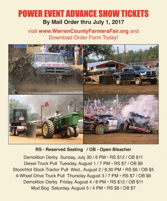 Advance tickets are now on sale for the Power Events - demolition derbies, truck and tractor pulls and the like - at the 80th Annual Warren County Farmers’ Fair this summer.