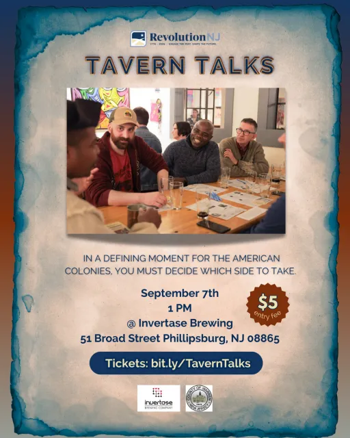 Anticipating the commemoration of the 250th anniversary of the American Revolution in New Jersey, Revolution NJ brings its Tavern Talks to Invertase Brewing. Imagine being in a tavern during the American Revolution and having to decide which side to take.