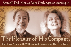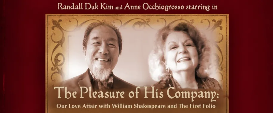 Honoring the anniversary of the birth and death of William Shakespeare, Centenary Stage Company presents classical theatre giants Randall Duk Kim and Anne Occhiogrosso starring in The Pleasure of His Company: Our Love Affair with William Shakespeare and the First Folio, an evening of personal recollections, dramatic scenes, and stories of Shakespeare's influence on Kim and Occhiogrosso's lives and careers for more than four decades on Sunday, April 23, 2017 at 3 p.m. in the Lackland Performing Arts Center.