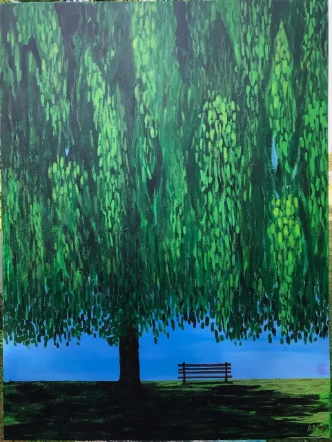 "I’ve included a small bench or swing to invite the viewer in. I kept feeling ‘big nature, little us’ as I worked. I hope my paintings make you feel more than you think - if just for a few moments," Noll said, adding, "I’m passionate about the healing capabilities of making and viewing art."