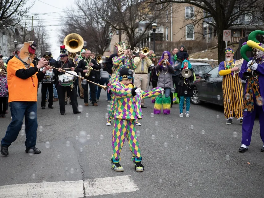 Led by the Big Easy Easton Brass, a New Orleans-style street band that just celebrated its first anniversary, the parade starts in Pennsylvania and ends in New Jersey. Participants step off from Easton’s Centre Square at The Bayou Southern Kitchen & Bar. The parade proceeds east on Northampton Street to cross the “Free Bridge” over the Delaware River into Phillipsburg’s Union Square, then turns right for a short walk to SoMa Downtown Grill at 62 S. Main St.