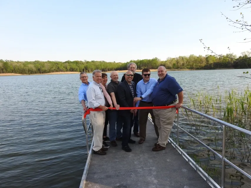 A ribbon-cutting on May 7 dedicated the new dock. Pictured at the ceremony (left to right) are David Lacouture, Chairman, Warren County Parks Foundation; John Lovell, Trustee, Warren County Parks Foundation; Susi Tilley, Executive Director, Ridge and Valley Conservancy; Kevin Duffy, Mayor, Hardwick Township; Jason Sarnoski, Warren County Freeholder Director; Jim McKim, Chairman, Hardwick Township Open Space Committee; James R. Kern III, Freeholder, Warren County; and James Perry, Committeeman, Hardwick Township.
