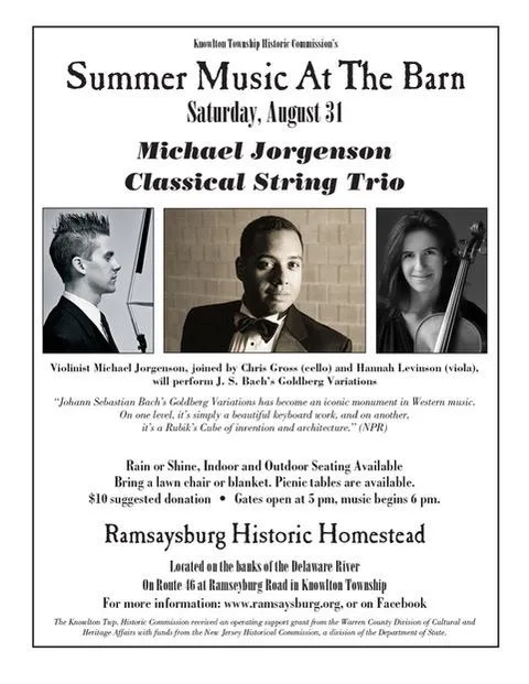 The third and final of this year’s Concerts at the Barn series at Ramsaysburg Historic Homestead in Knowlton Township features the Michael Jorgenson Classical String Trio on Saturday, August 31, 2019. The unusual program features three prominent string players performing a unique version of J. S. Bach’s Goldberg Variations in the work’s entirety.