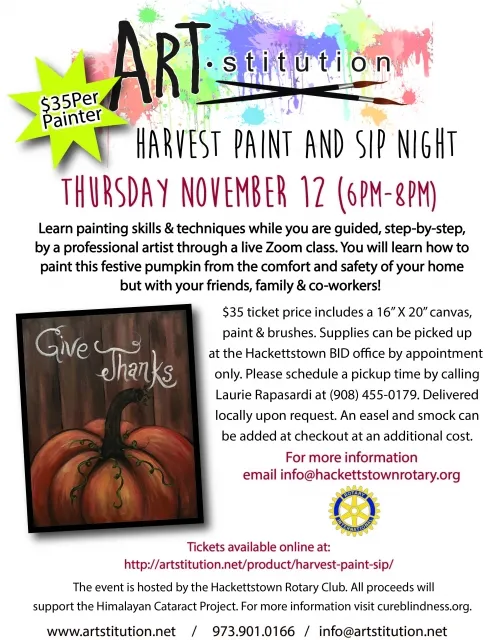 Hackettstown Rotary Club is holding a virtual Harvest Paint and Sip Night fundraiser, a Zoom event where attendees will learn painting skills and techniques while being guided by a professional artist. Participants will learn how to paint a festive pumpkin from the comfort and safety at home.