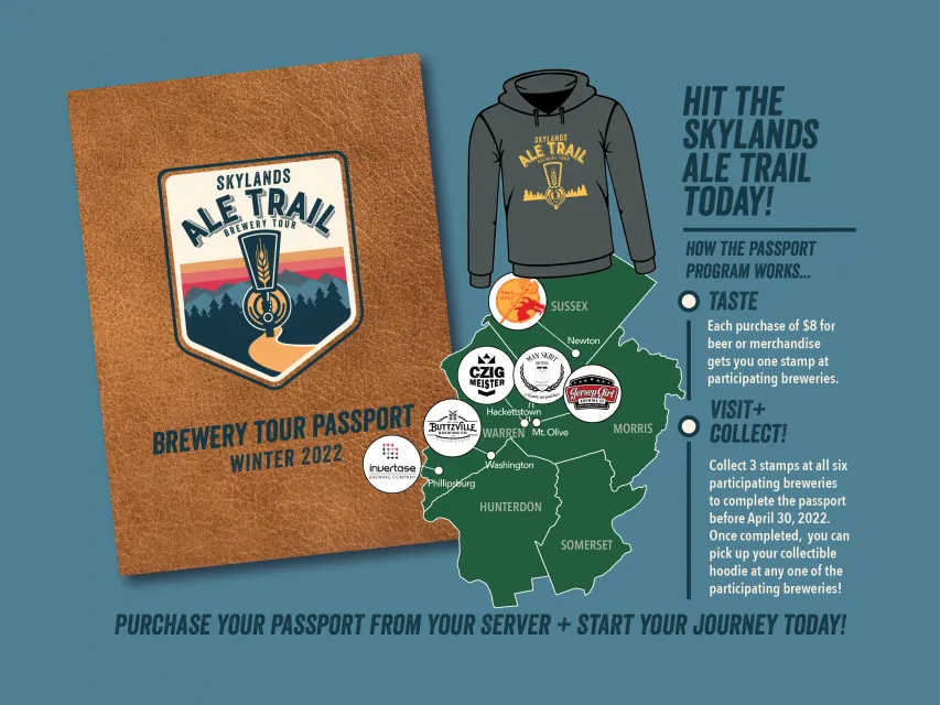 Hit the Skylands Ale Trail! Start by visiting one of six participating breweries - four of which are located in Warren County - and ask your server to purchase a Brewery Tour Passport. Taste as you wish. Each $8 purchase of beer or merchandise from a particpating brewery earns you a stamp on your passport. Collect three stamps at all six participating breweries before April 30, 2022 to complete your passport. Once complete, you may claim a collectible hoodie from any one of the participating locations!