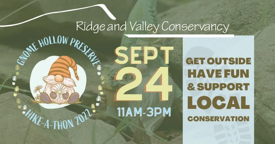 Ridge and Valley Conservancy is hosting a Hike-a-thon at the Gnome Hollow Preserve to raise public awareness and funds to preserve and protect natural areas and all they offer to nature lovers. It's a day in the woods with friends and family for this moderate 3-mile hike or a shorter, flat-terrain loop around the pond. There will be food trucks and an ice cream truck, with participants invited to stay for a picnic on the rolling lawns and enjoy exhibitors from local wildlife rehabilitation centers.